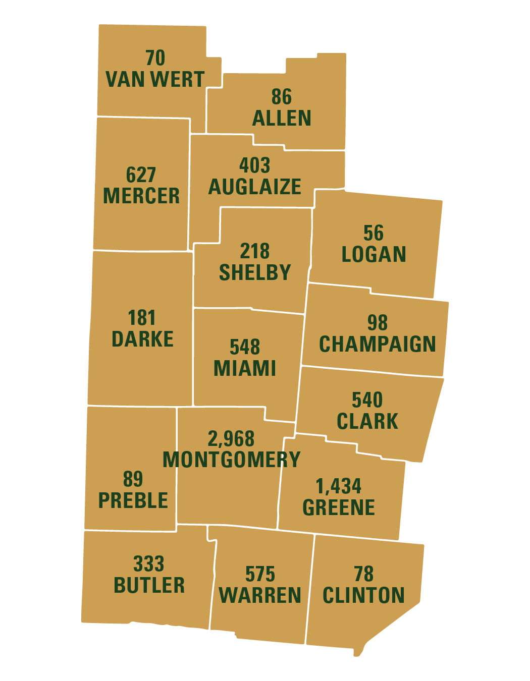 | Darke | 181 | Van Wert | 70 |
