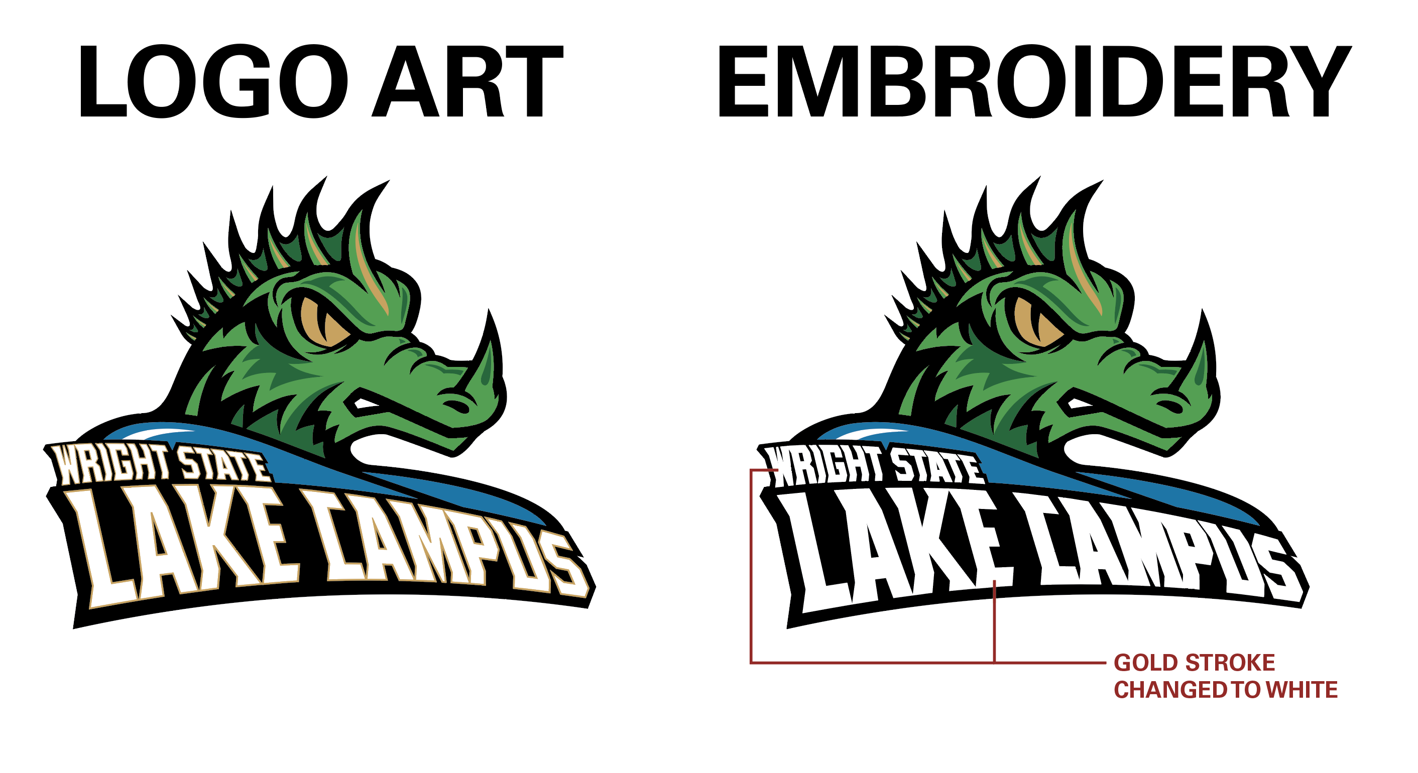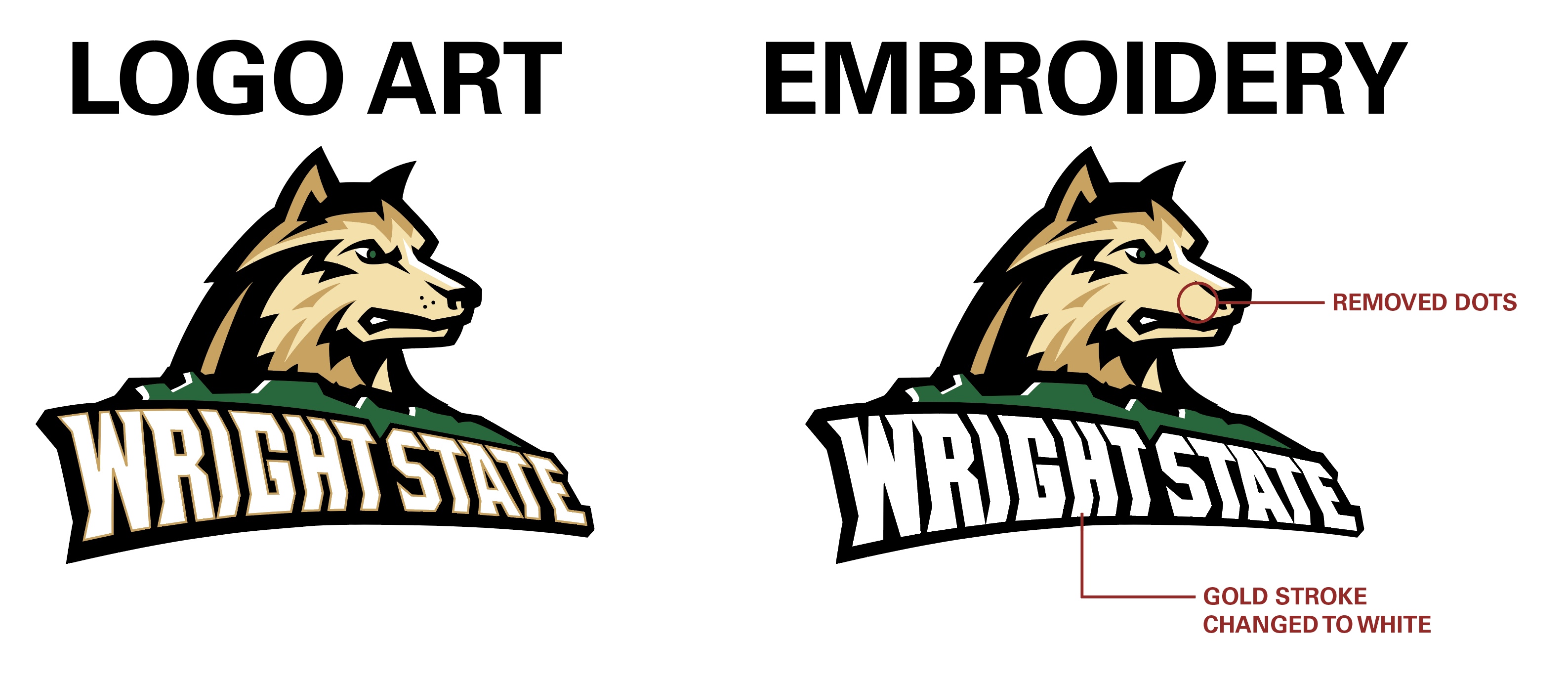 When it comes to embroidery, the Wright State Athletics logos have been altered for simplified embroidery reproduction purposes. Contact the Office of Marketing or Athletics for more information.