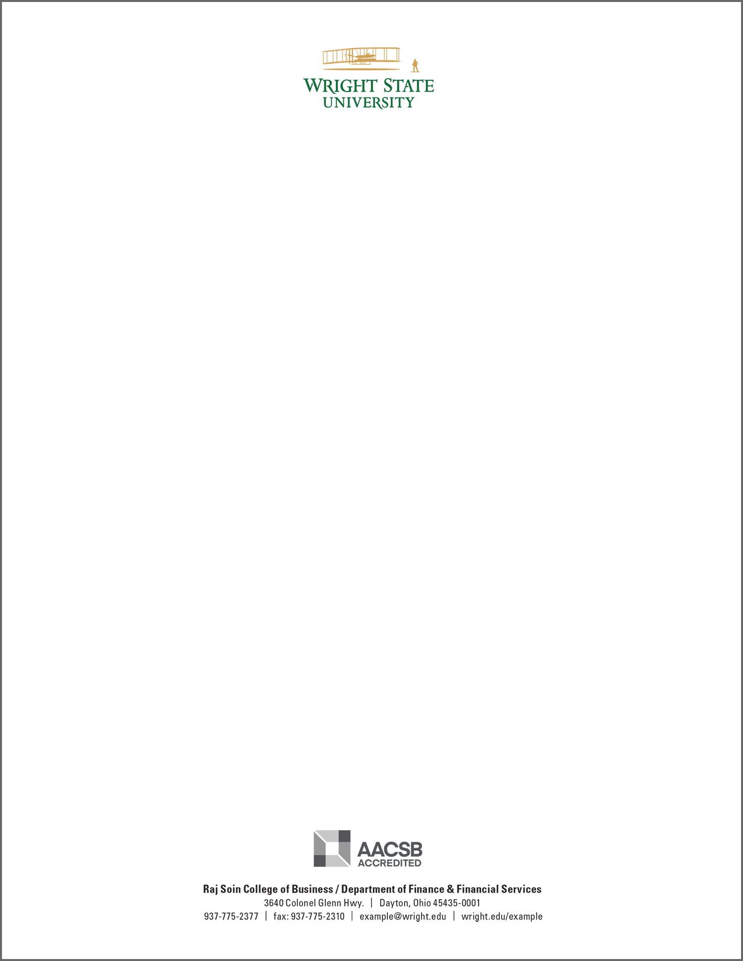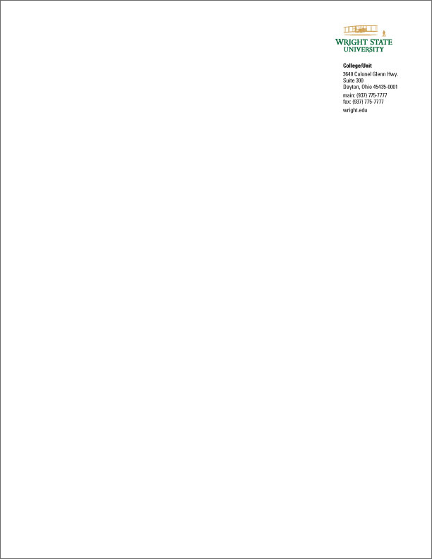 The Wright State University letterhead uses the primary mark and approved colors. All colleges, schools, departments, divisions, institutes, offices, centers, and units need to use the standard letterhead design.