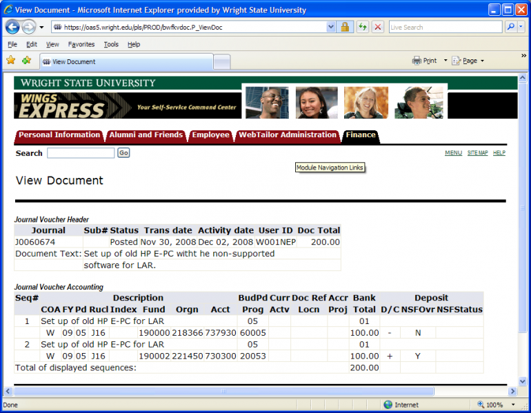 - View the image below to see a portion of a journal voucher (JV) from WINGS Express Finance. You will notice that it asks for the FOAPAL. Hopefully, you can associate all elements described above with the appropriate box in the JV.