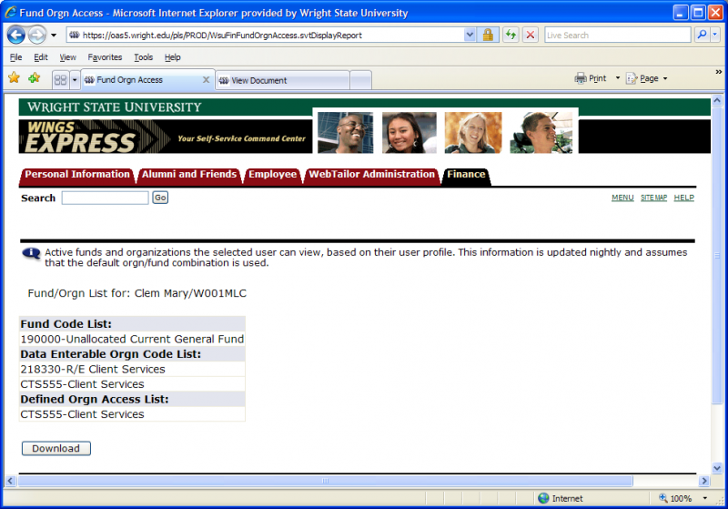 - The display shows all the active funds and orgs that user is able to View in Finance. If changes need to be made to the list of funds and orgs, please contact your Business Manager. See the image below to view sample output.