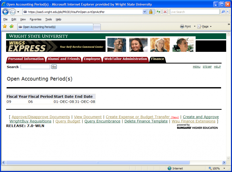 - The WINGS Express Finance > Open Accounting Periods link displays accounting periods currently open.