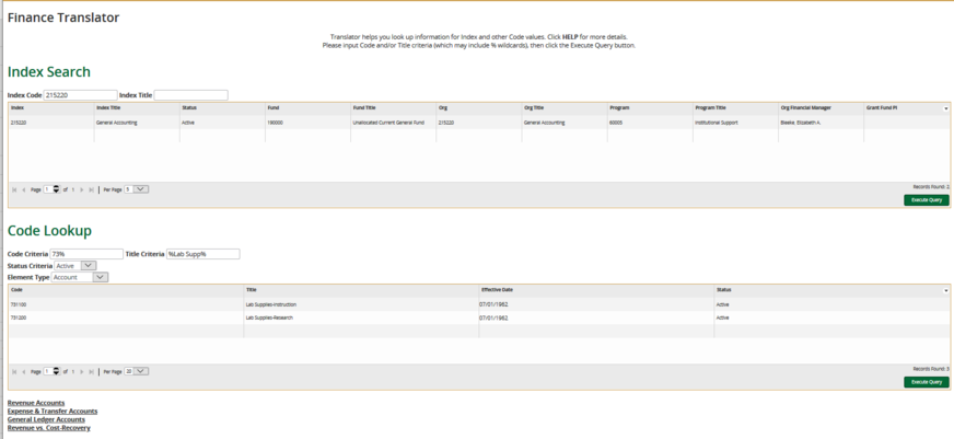 To search for any Fund/Organization/Program definition you can use the Translator link, Index Search. Input the Index Code or Index Title and click the Execute Query button to return the Fund, Org, and Program for a given Index along with the status (active/inactive), related Financial Manager, and Principal Investigator for grant-related funds. You may use the % wildcard to search for a particular org code or title. For example, type 2152% and click the Execute Query button - it will then display a listing of fund, orgs, and programs for all indexes that begin with 2152.