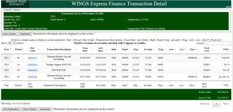 Transaction Detail query is very useful to get a list of all transactions for a given fund/org for monthly reconciliations or to search for specific transactions you are interested in. This report was created in-house at WSU.