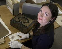 Graduate public history student Hadley Drodge is going through photos, drawings, Bibles and other materials to assemble the exhibit at the National Afro-American Museum.