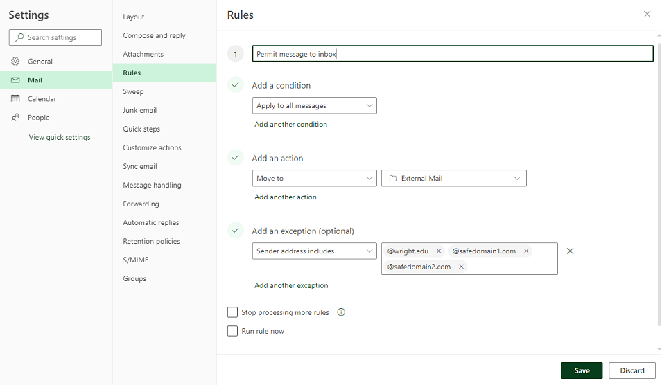 - Add an exception to this rule to permit 'legitimate' emails from being filtered; CaTS recommends filtering by the sender domain, such as @wright.edu