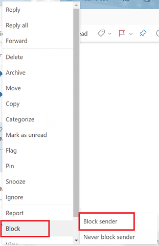 - Right-click on the spam message in your Inbox, and select Block > Block sender