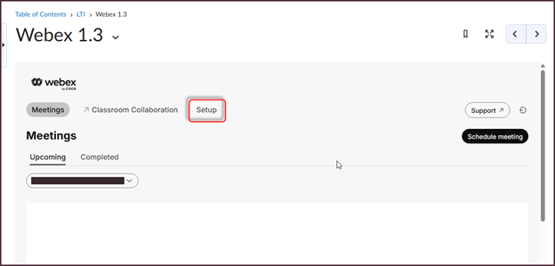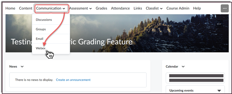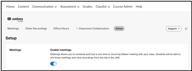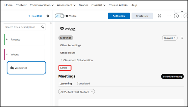For easier viewing during Setup, we recommend you access Webex LTI from the “Communication“ Navbar drop-down menu of your Pilot couse.