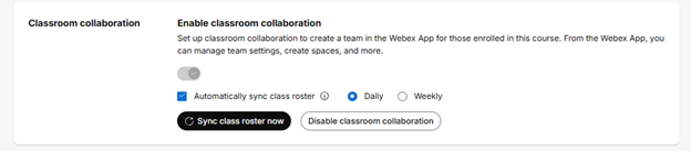 The classroom collaboration experience inside the LMS has changed in Webex LTI. Select the “Classroom collaboration” tab to open your class team in the Webex App for web. The course's team is opened on web.webex.com. After the first time, you can access your Classroom collaborations teams via the Webex App. (Note: Previously in Webex Education Connector, the course's team was accessed through a widget embedded in a webpage from the LMS or the Webex App.)
