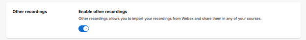 If enabled, you can import your non-Webex LTI recordings from your Webex cloud recordings available on Webex User Hub and share them in your course.