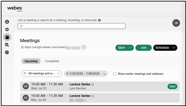 You have access to your Webex Hub by visiting and using your WSU credentials to sign into wright.webex.com. This page holds both your cloud recordings & sessions scheduled through the Webex LTI in Pilot as well as any additional meetings you’ve scheduled from the hub.