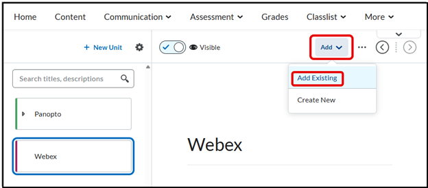Cisco Webex LTI (formerly Webex Education Connector) is an external learning tool integrated in Pilot that is used for conducting classes in a live synchronous virtual classroom, as well as for asynchronous work. This tool can be used to schedule virtual class meetings, promote online group work, and to schedule virtual office hours using Cisco Webex Meetings. Webex is always available from the “Communication“ Navbar drop-down menu in the standard Pilot course template. If you prefer, you can add it to one of your Content Units (formerly Content Modules). However, we recommend you use the “Communication“ Navbar drop-down menu.