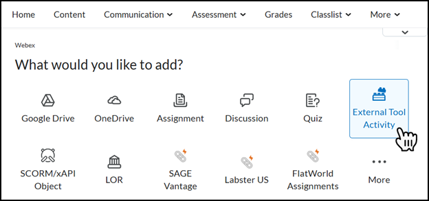- On the “What would you like to add?” page, select “External Tool Activity”.