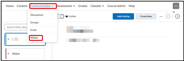 Cisco Webex LTI (formerly Webex Education Connector) is an external learning tool integrated in Pilot that is used for conducting classes in a live synchronous virtual classroom, as well as for asynchronous work. This tool can be used to schedule virtual class meetings, promote online group work, and to schedule virtual office hours using Cisco Webex Meetings. Webex is always available from the “Communication“ Navbar drop-down menu in the standard Pilot course template. If you prefer, you can add Webex to one of your Content Modules as an External Learning Tool. However, we recommend you use the “Communication“ Navbar drop-down menu. Either way, below we’ll tell you how to access and set it up.