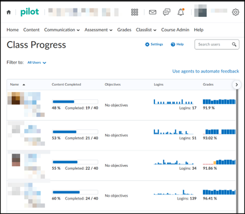Class Progress is located under Assessment in the Navbar as well as Course Admin. When clicking on Class Progress, you can get a general overview of each student's course progress.