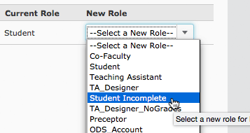 On the “Change Enrollments” page, select Student Incomplete for the New Role.