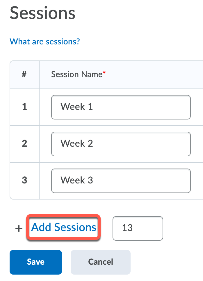 Enter the number of sessions that you want to record (minus the first three that are already showing) and click on “Add Sessions”. You also need to name these sessions, which is typically named for each week of the course.