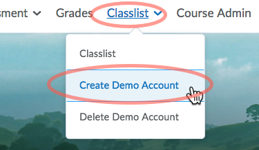 Click “Class List” on the course navigation bar and select “Create Demo Account.” The demo student will be created and will appear in your Classlist.