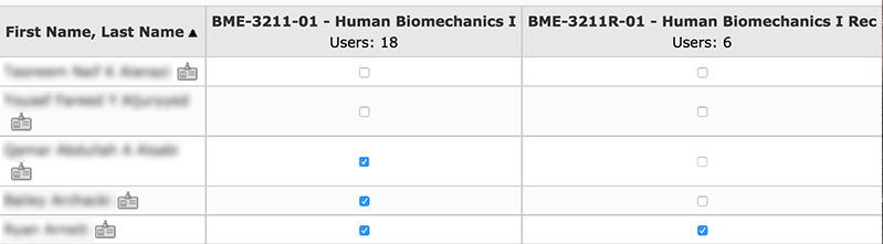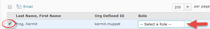 Check the box beside the person’s name. Select a role (i.e. student, faculty, teaching assistant, etc.), and select a section from the dropdown menus.