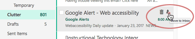 To move a message from Clutter to your inbox, hover over the email message and click the small icon that appears: