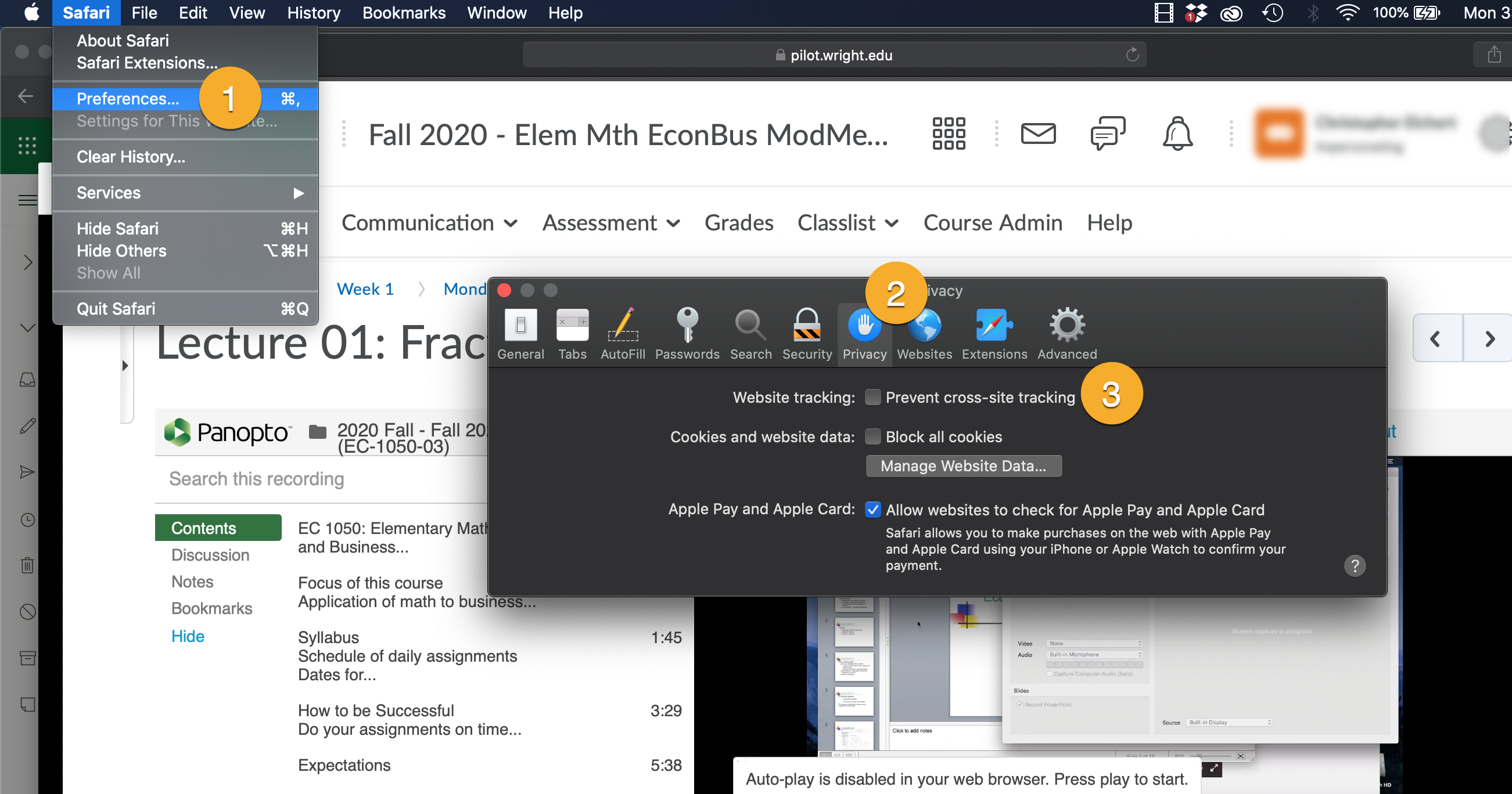 If a student tries to play a Panopto video in Pilot and the video frame displays the Pilot homepage instead of the video, the student probably has a Safari security feature enabled. Switching to Chrome or Firefox should work for all videos in Pilot, but the Safari security setting can also be disabled easily.