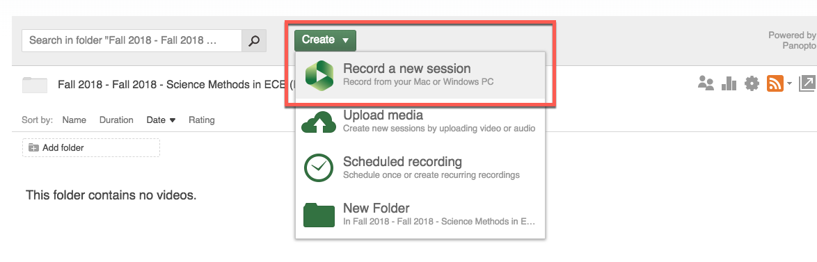 To use the Panopto Recorder for Windows or Mac, you must first log-in to Pilot from a web browser on your computer. Navigate to the appropriate Pilot course that has either the Panopto widget on the course home page or the Panopto external learning tool in course Content. Click the Panopto widget or external learning tool and you will see the large green “Create” button. Click the green Create button and select “Record a New Session,” as shown in the image below.