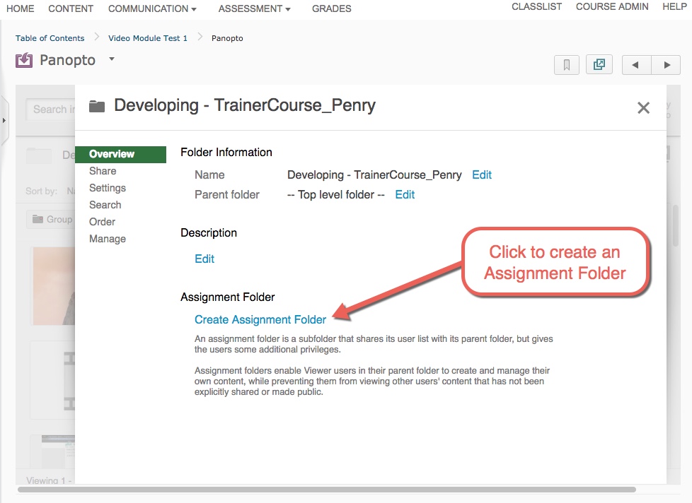 There can only be one Assignment Folder within a Panopto folder. If you wanted multiple Assignment Folders (e.g., Week 1 Assignment Folder, Week 2 Assignment Folder, etc.), this can be done by creating general sub-folders (e.g., Week 1 folder, Week 2 folder, etc.) and creating an Assignment Folder within each of those general sub-folders.