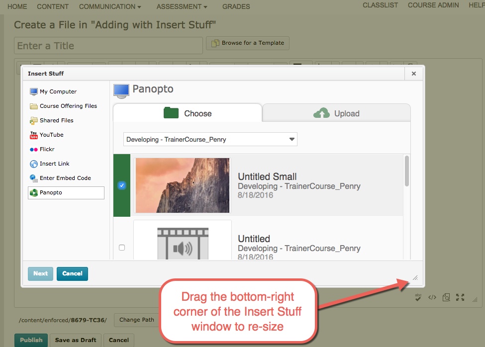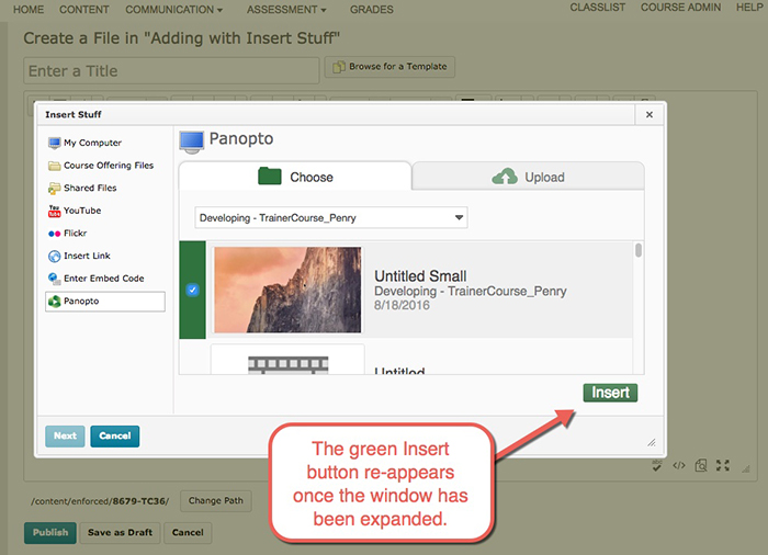 If the resolution on your computer monitor or device is small, you may not see the green Insert button when trying to embed a Panopto video using the Insert Stuff tool. This issue is known and is actively being addressed.