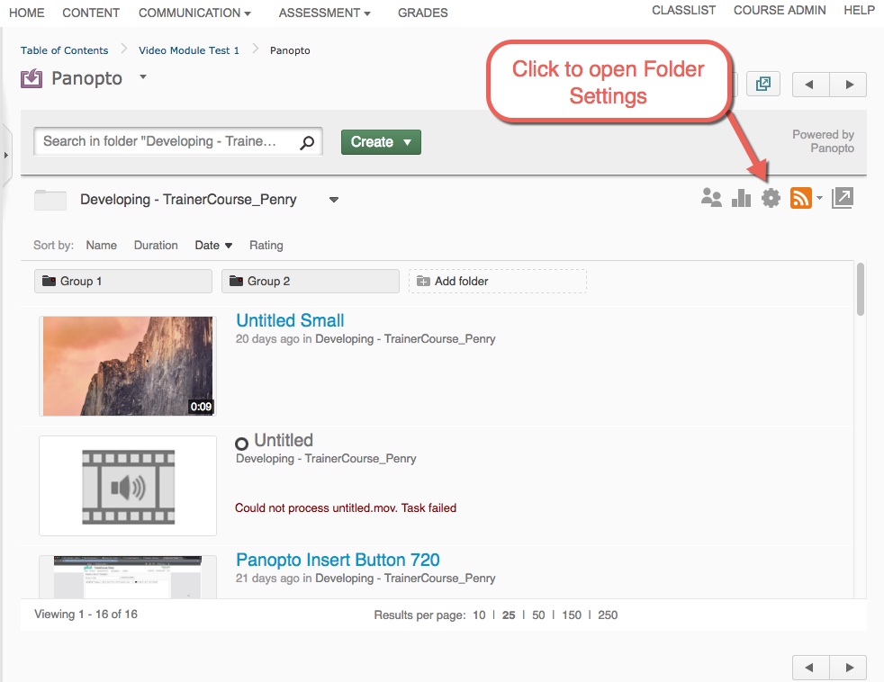 To do so, launch Panopto in Pilot and click the gear icon to display the course Folder Settings (as seen in the image below).