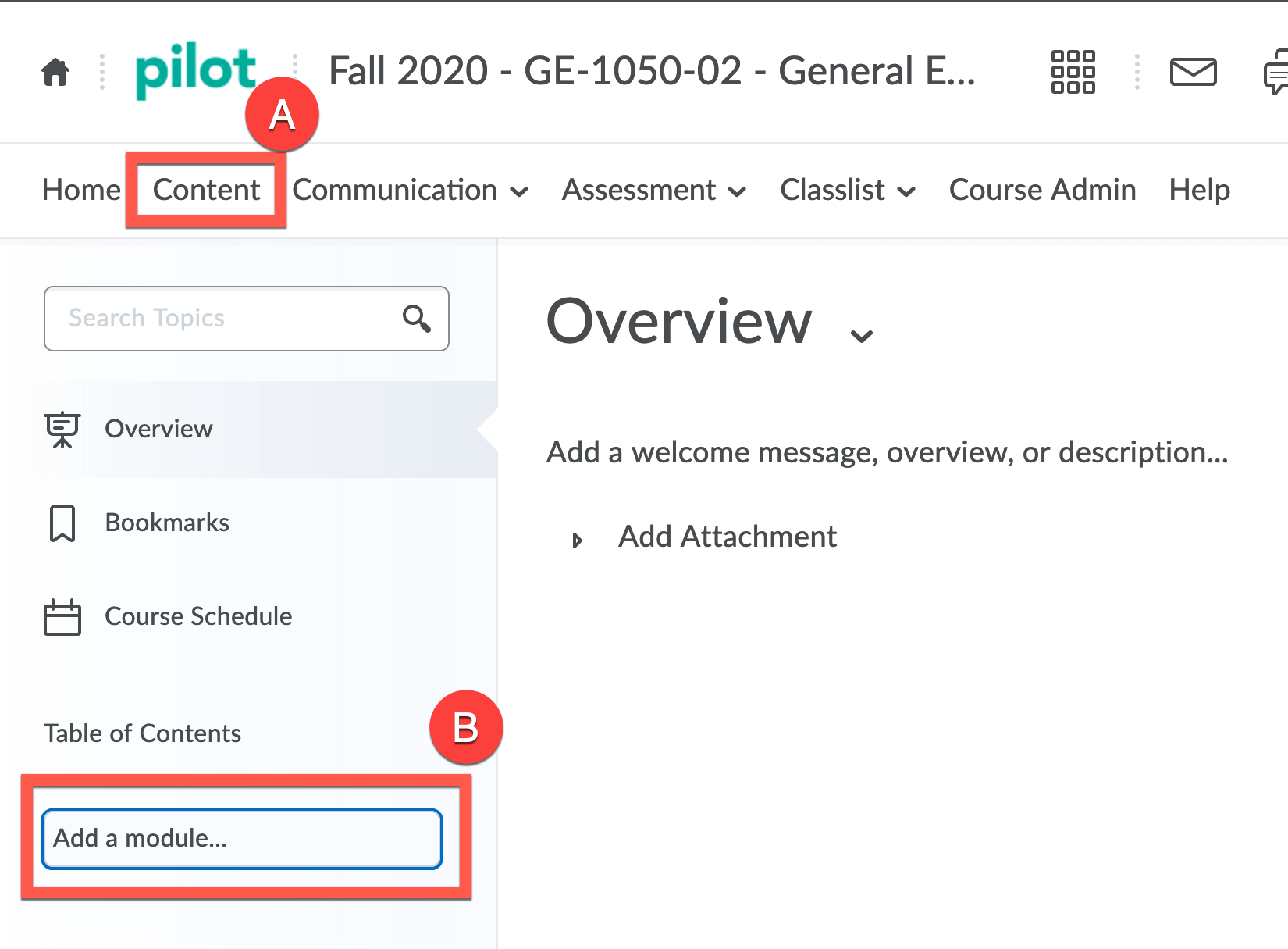 Navigate to your Pilot course, click Content from the course navigation bar, and either select an existing module from the Table of Contents or create a new module by clicking into the “Add a module” text box, giving it a title, and pressing return/enter on the keyboard.