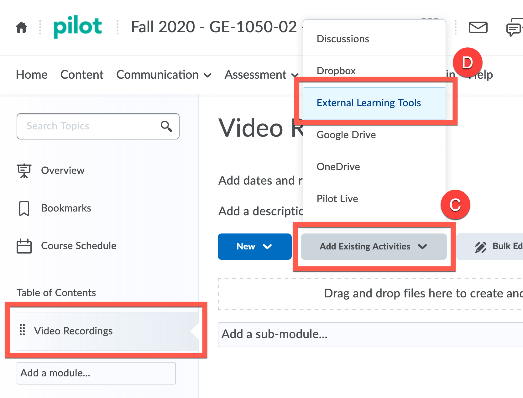 Your lecture videos will need a place to live in your Pilot course, so the first thing you’ll need to do is add it to your Pilot course section. Students will also access recorded videos from this Panopto link as well.