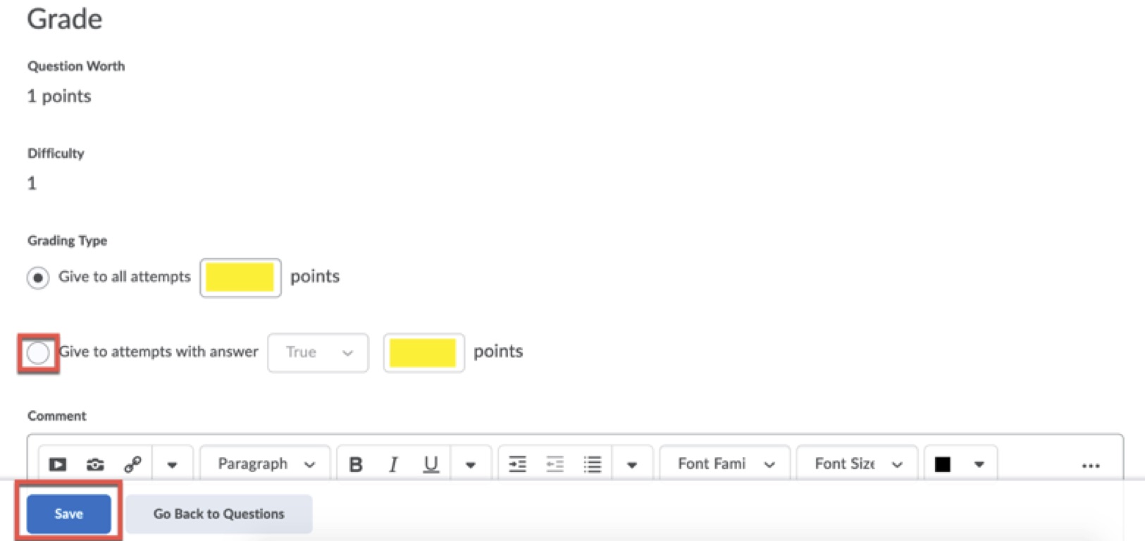 A little farther down the page, you will see the “Grade” section. Here, you can give all attempts a certain number of points, regardless of which answers were checked. Or you can choose to give points to anyone who chose a particular answer.