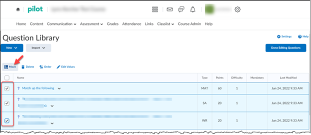 Select the questions you want to move into the section and click Move.