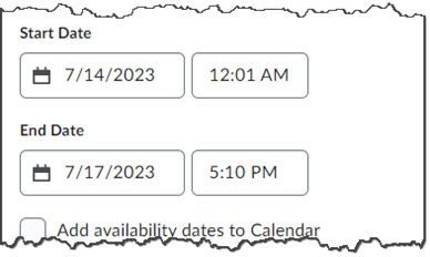 These dates display the dates and times during which the learner can start the quiz. Once started, even if just with one minute remaining in availability time, they have the indicated time in the time limit to complete the exam.