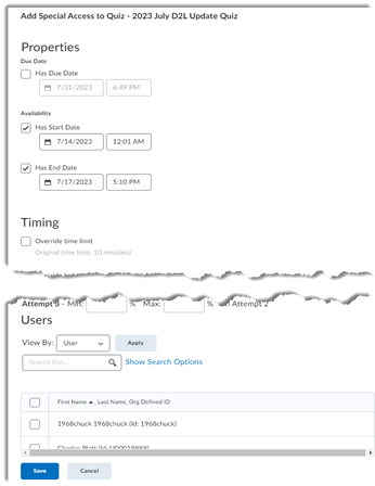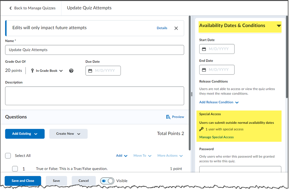 Special Accommodations, a.k.a. "Special Access," allows you to provide a student with additional time and/or attempts to complete a quiz.