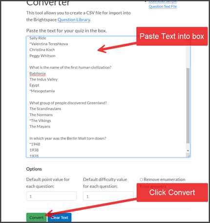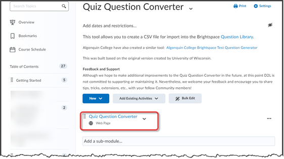 - Create your quiz questions. You can create questions in either the Question Library (recommended) or within the quiz. You can also import properly formatted questions from Respondus, a quiz generating software package.