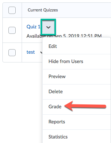 Click the arrow next to the name of the quiz and choose “Grade.”