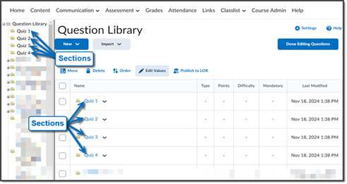 Navigate to Assessment, Quizzes & Exams, Question Library, then click New and Section.