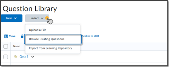In the quiz question area, click Add Existing and select Browse Question Library.