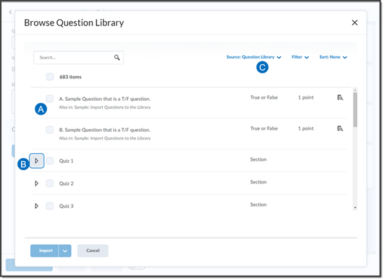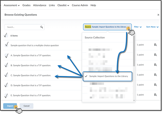 In the pop-up, select questions from the available list, or choose a source from the drop menu. When you have selected the questions, click Import.