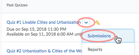 On the Quizzes page, click the little downward-pointing arrow next to the quiz and choose “Submissions.”