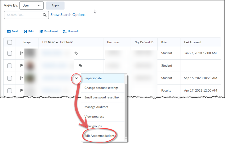 Next to the student's name, if you see a gear/peoplehead, you know they already have course level accommodations. If you do not see that, click the action arrow next to their name and select Edit Accommodations.