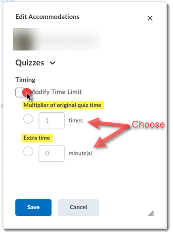 In the pop-up, select Modify Time Limit, select either "Multiplier of original quiz time" or "Extra Time." Then fill in the appropriate amount and click Save.