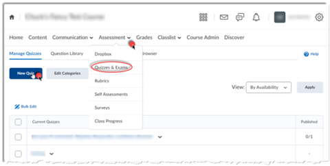 From “Assessment” on the navbar, choose “Quizzes and Exams.”