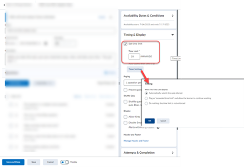 In this section, you can set the time limit for taking the quiz, determine the number of questions per page, as well as a few other helpful settings.