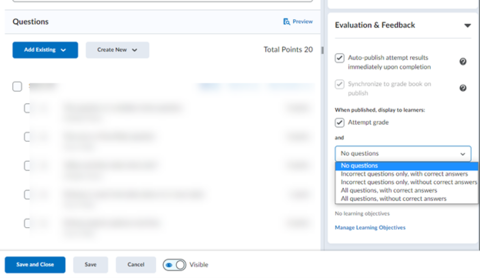 When published, display to learners: In this section, you determine if they see their grade as well as any of the quiz questions and answers when they submit.