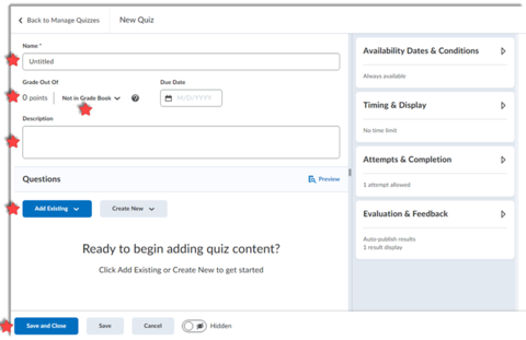 When the new quiz page appears, enter a quiz Name, determine if it should be in the gradebook, enter point value, determine if it needs a description, add questions, set dates, timing and other options, and Save.