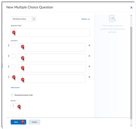 In the New Question pop-up, fill in the question text, fill in the answer options, select the correct answer, add points to the question, and Save.