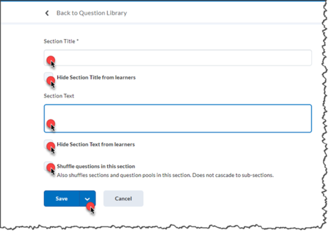 Title the section and determine if the section title and text will be hidden, as well as whether the questions will be shuffled. Click Save.