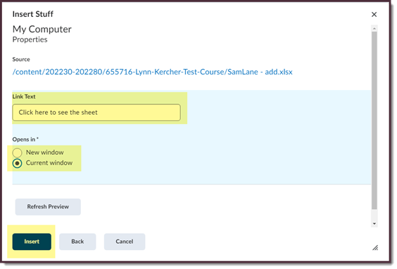 IMPORTANT: It does NOT work with a CSV file. It must be an Excel file. - In the Link Text field, title the link, Select Current Window, and press the blue Insert button.